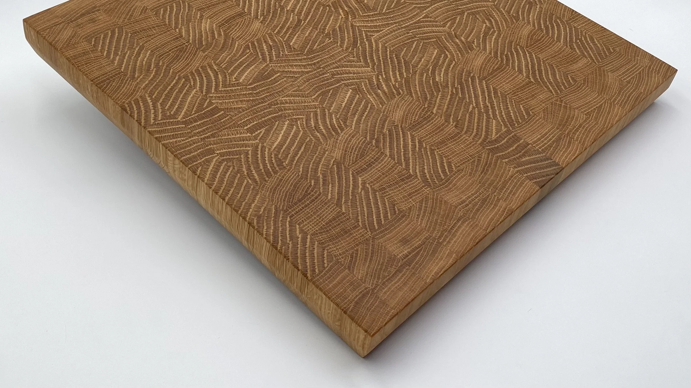 Large sized white oak end-grain cutting board. This is a 16” x 15” x 1.5” end grain style cutting board made out of the highest quality materials. This board features a subtle under-bevel and is available with or without rubber feet.